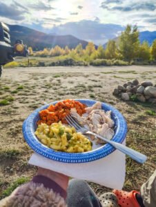 After finishing the ride, we landed at a scenic, panoramic view dispersed site along Twin Lakes. We stayed all the way through Sunday, mostly just chilling at the camper or walking around the lakes to take in the views. One of the days we made turkey tenderloin in our little crockpot and paired it with mashed cinnamon sweet potatoes and broccoli cheddar mac, and we just knew the whole area could smell that delicious goodness when we opted to eat outside while watching the sunset.